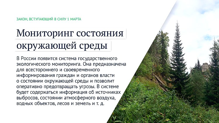 В России появится система государственного экологического мониторинга. Она предназначена для всестороннего и своевременного информирования граждан и органов власти о состоянии окружающей среды и позволит оперативно предотвращать угрозы. В системе будет содержаться информация об источниках выбросов, состоянии атмосферного воздуха, водных объектов, лесов и земель и т. д.