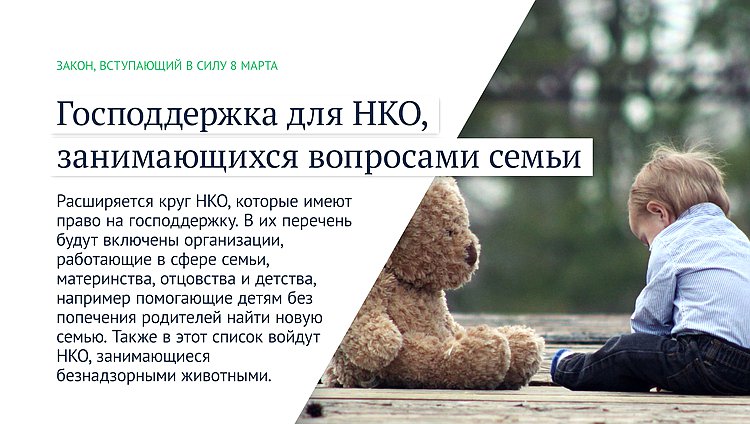Расширяется круг НКО, которые имеют право на господдержку. В их перечень будут включены организации, работающие в сфере семьи, материнства, отцовства и детства, например помогающие детям без попечения родителей найти новую семью. Также в этот список войдут НКО, занимающиеся безнадзорными животными.
