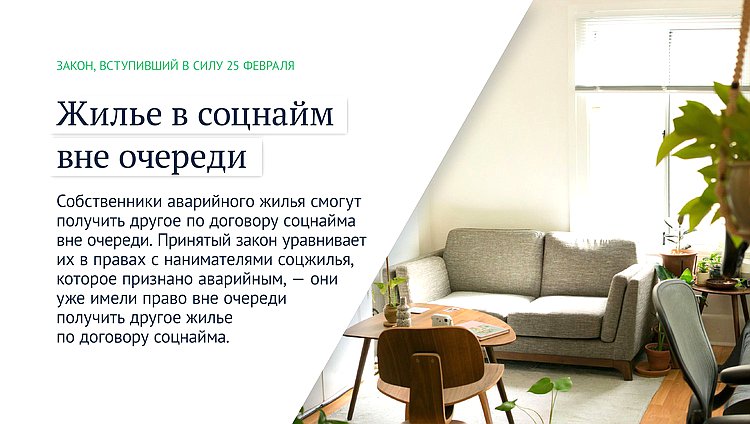 «Решение уравнять в праве на внеочередное получение квартиры по договору соцнайма собственников и нанимателей, если их единственное жилье не подлежит ремонту или реконструкции, позволит в первую очередь поддержать семьи с невысоким доходом, оказавшиеся в сложной жизненной ситуации», — отмечал Председатель ГД Вячеслав Володин.