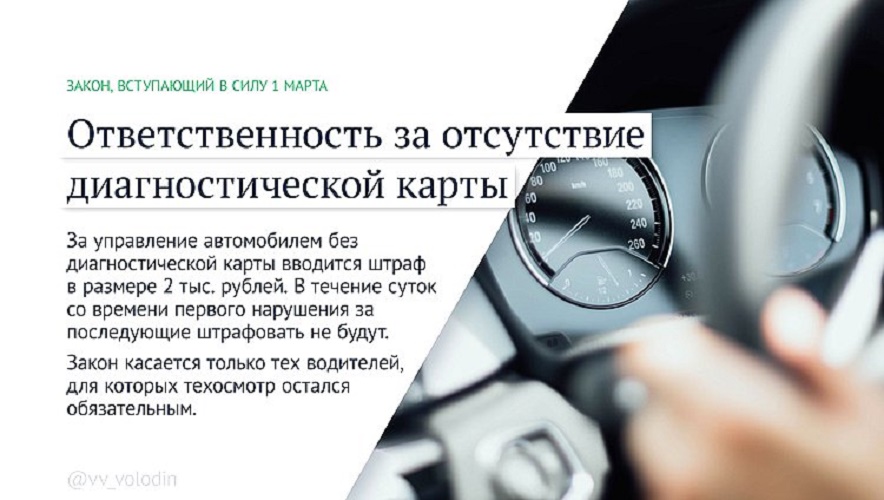 За управление автомобилем без диагностической карты вводится штраф в размере 2 тыс. рублей. В течение суток со времени первого нарушения за последующие штрафовать не будут.