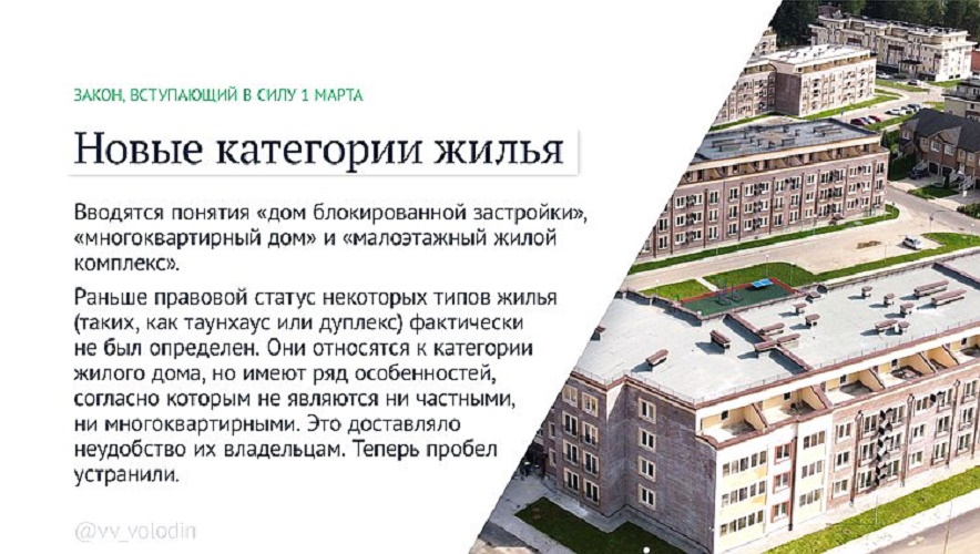 В российское законодательство вводится понятие «дом блокированной застройки» в качестве вида жилого дома. В том числе это позволит снять вопрос о включении таких ветхих домов в региональные программы по проведению капитального ремонта», — пояснил Вячеслав Володин.