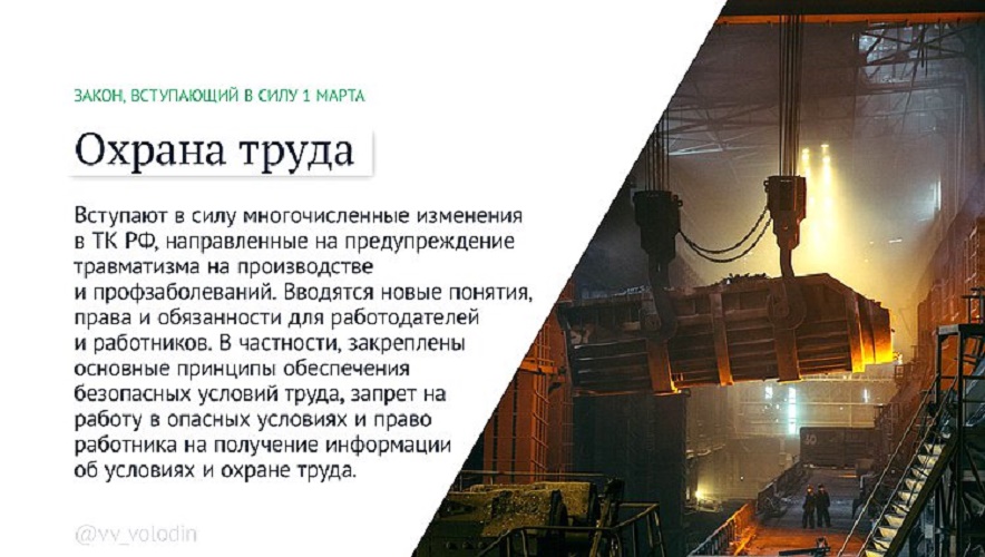 Вступают в силу многочисленные изменения в ТК РФ, направленные на предупреждение травматизма на производстве и профзаболеваний. Вводятся новые понятия, права и обязанности для работодателей и работников. В частности, закреплены основные принципы обеспечения безопасных условий труда, запрет на работу в опасных условиях и право работника на получение информации об условиях и охране труда.