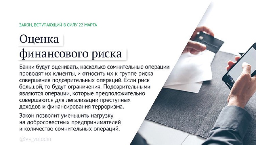 Банки будут оценивать, насколько сомнительные операции проводят их клиенты, и относить их к группе риска совершения подозрительных операций. Если риск большой, то будут ограничения. Подозрительными являются операции, которые предположительно совершаются для легализации преступных доходов и финансирования терроризма.