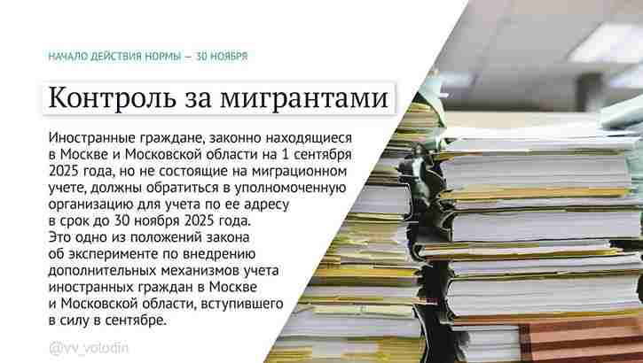 Иностранные граждане, законно находящиеся в Москве и Московской области на 1 сентября 2025 года, но не состоящие на миграционном учете, должны обратиться в уполномоченную организацию для учета по ее адресу в срок до 30 ноября 2025 года. Это одно из положений закона об эксперименте по внедрению дополнительных механизмов учета иностранных граждан в Москве и Московской области, вступившего в силу в сентябре.