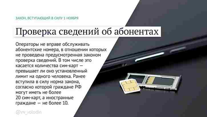 Операторы не вправе обслуживать абонентские номера, в отношении которых не проведена предусмотренная законом проверка сведений. В том числе это касается количества сим-карт — превышает ли оно установленный лимит на одного человека. Ранее вступила в силу норма закона, согласно которой граждане РФ могут иметь не более 20 сим-карт, а иностранные граждане — не более 10.