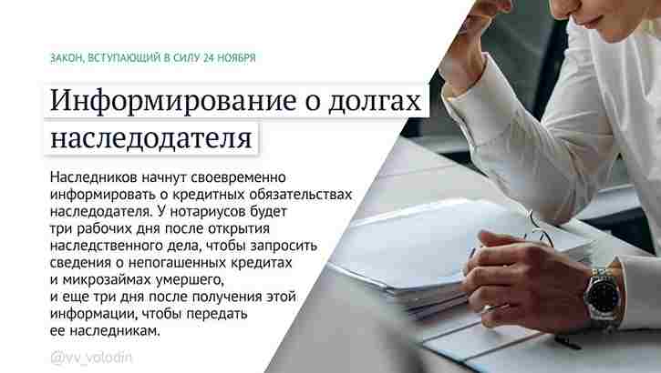 Наследников начнут своевременно информировать о кредитных обязательствах наследодателя. У нотариусов будет три рабочих дня после открытия наследственного дела, чтобы запросить сведения о непогашенных кредитах и микрозаймах умершего, и еще три дня после получения этой информации, чтобы передать ее наследникам.