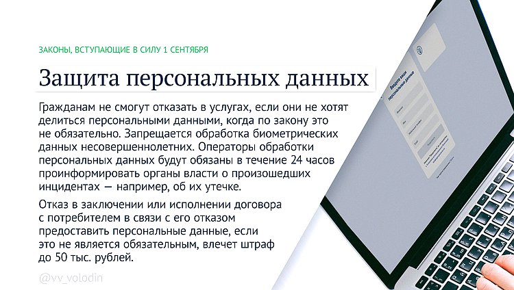 «Сейчас при совершении покупок или оплате услуг у людей под разными предлогами собирают номера телефонов, адреса электронной почты и другие личные сведения — даже в тех случаях, когда предоставление такой информации не является обязательным. Прежде всего это касается онлайн-магазинов. Если покупатель не хочет сообщать сотрудникам обычного или интернет-магазина свое полное имя, номер телефона и банковской карты, электронную почту и домашний адрес, ему не смогут отказать в покупке», — отметил Председатель ГД Вячеслав Володин.