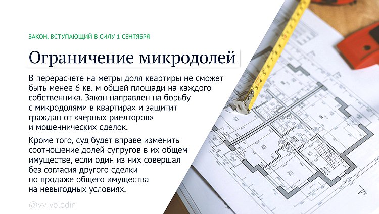 В перерасчете на метры доля квартиры не сможет быть менее 6 кв. м общей площади на каждого собственника. Закон направлен на борьбу с микродолями в квартирах и защитит граждан от «черных риелторов» и мошеннических сделок.