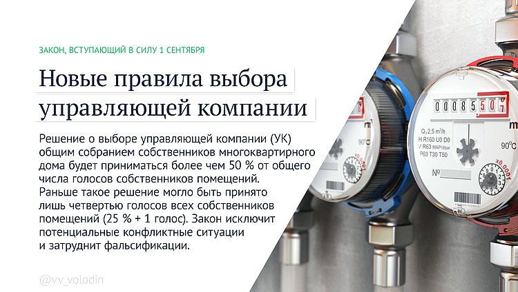 Решение о выборе управляющей компании (УК) общим собранием собственников многоквартирного дома будет приниматься более чем 50 % от общего числа голосов собственников помещений. Раньше такое решение могло быть принято лишь четвертью голосов всех собственников помещений (25 % + 1 голос). Закон исключит потенциальные конфликтные ситуации и затруднит фальсификации.