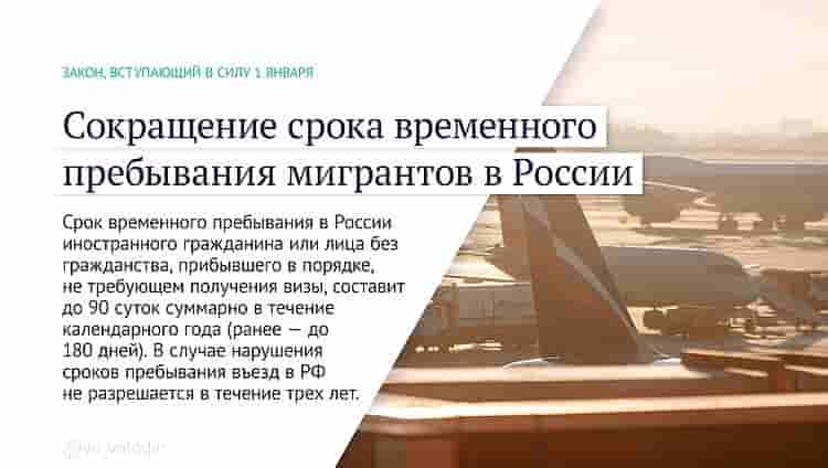 Срок временного пребывания в России иностранного гражданина или лица без гражданства, прибывшего в порядке, не требующем получения визы, составит до 90 суток суммарно в течение календарного года (ранее — до 180 дней). В случае нарушения сроков пребывания въезд в РФ не разрешается в течение трех лет.