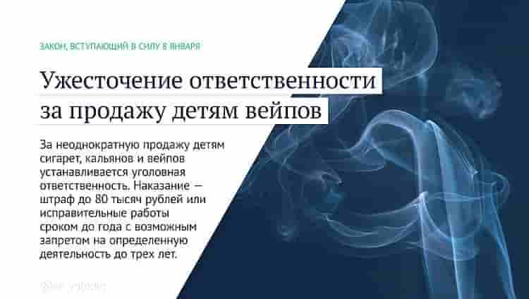 За неоднократную продажу детям сигарет, кальянов и вейпов устанавливается уголовная ответственность. Наказание — штраф до 80 тысяч рублей или исправительные работы сроком до года с возможным запретом на определенную деятельность до трех лет.