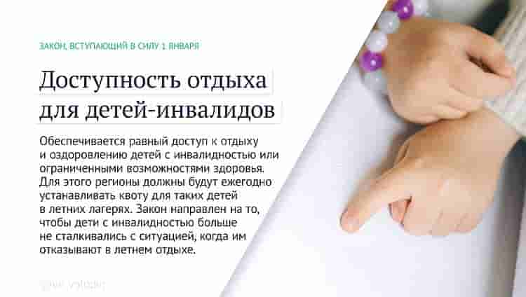 Обеспечивается равный доступ к отдыху и оздоровлению детей с инвалидностью или ограниченными возможностями здоровья. Для этого регионы должны будут ежегодно устанавливать квоту для таких детей в летних лагерях. Закон направлен на то, чтобы дети с инвалидностью больше не сталкивались с ситуацией, когда им отказывают в летнем отдыхе.
