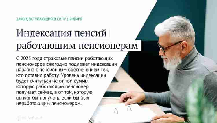 С 2025 года страховые пенсии работающих пенсионеров ежегодно подлежат индексации наравне с пенсионным обеспечением тех, кто оставил работу. Уровень индексации будет считаться не от той суммы, которую работающий пенсионер получает сейчас, а от той, которую он мог бы получать, если бы был неработающим пенсионером.
