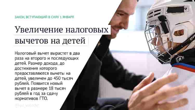 Налоговый вычет вырастет в два раза на второго и последующих детей. Размер дохода, до достижения которого предоставляются вычеты на детей, увеличен до 450 тысяч рублей. Появится новый вычет в размере 18 тысяч рублей в год за сдачу нормативов ГТО.