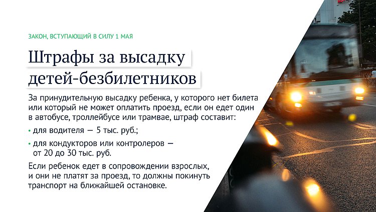 Штрафы за высадку детей без билета из транспорта, упрощение получения налоговых вычетов и госуслуг и другие нововведения последнего месяца весны — в нашем материале