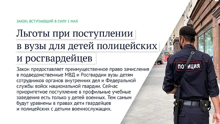 Закон предоставляет преимущественное право зачисления в подведомственные МВД и Росгвардии вузы детям сотрудников органов внутренних дел и Федеральной службы войск национальной гвардии. Сейчас приоритетное поступление в профильные учебные заведения есть только у детей военных. Тем самым будут уравнены в правах дети гвардейцев и полицейских с детьми военнослужащих.