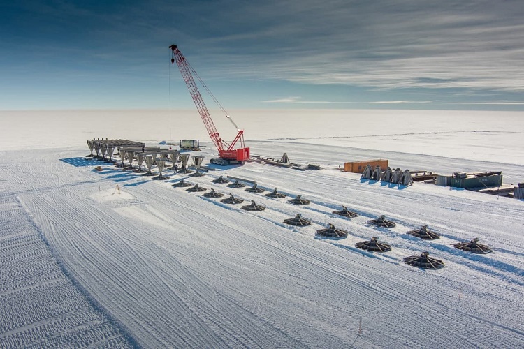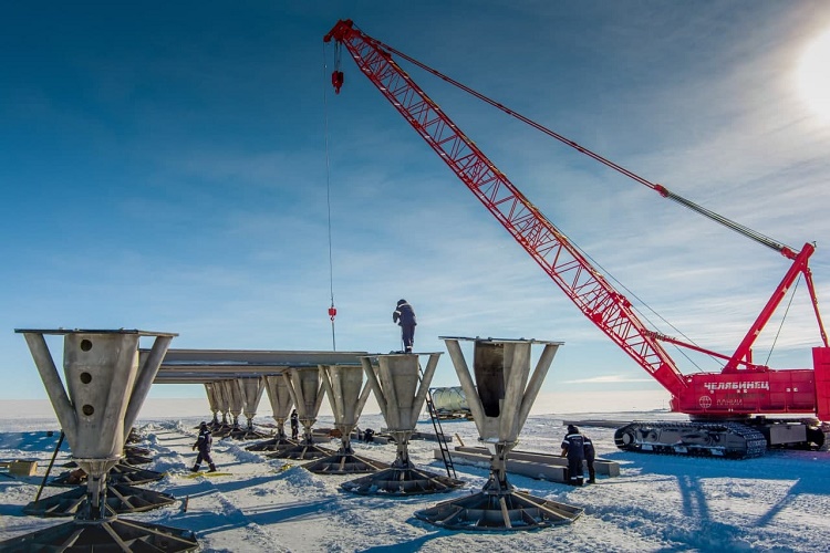 В рамках работ по сборке Комплекса на подготовленном фундаменте с помощью крана установлены 36 опор высотой 3 м, которые позволят станции оставаться незанесённой на протяжении многих лет.