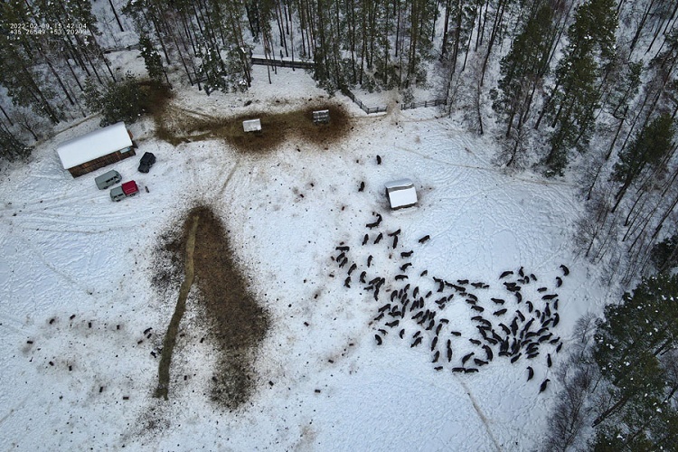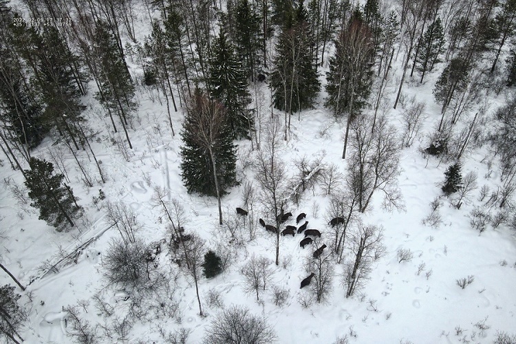 Тех зубров, которые любят «ходить в гости» на соседние подкормочные площадки, отслеживали с помощью фотоловушек. По их данным можно понять, какая группа, в каком количестве, в какой день, час и как долго находилась в конкретном месте. Любителей играть в прятки и держать дистанцию даже под пологом леса «поймал» квадрокоптер при помощи тепловизора. И он же позволил получить точные сведения о количестве животных в самой многочисленной группе. На стоп-кадре из видео беспилотного летательного аппарата научные сотрудники могут их посчитать с точностью до самого младшего зубренка.